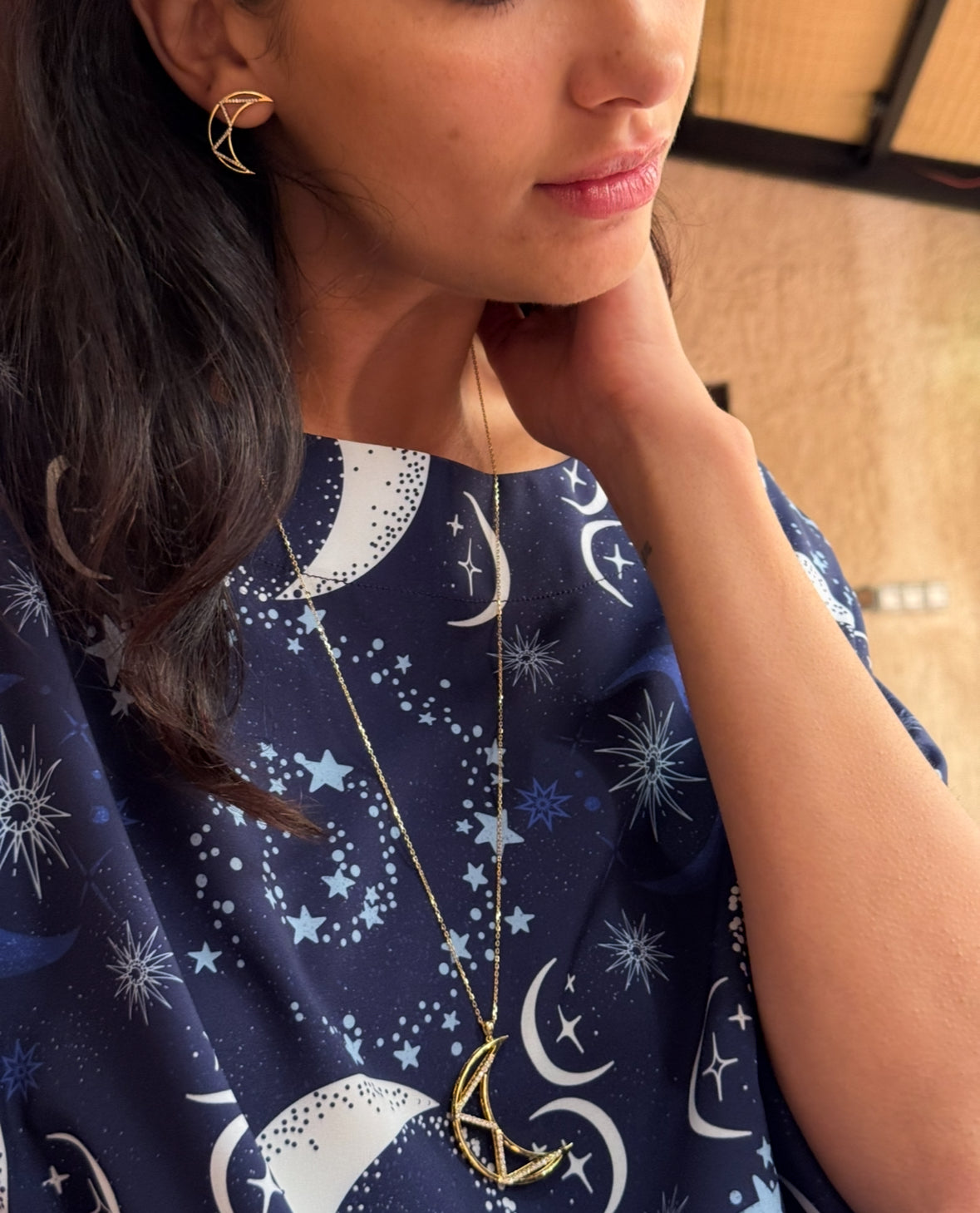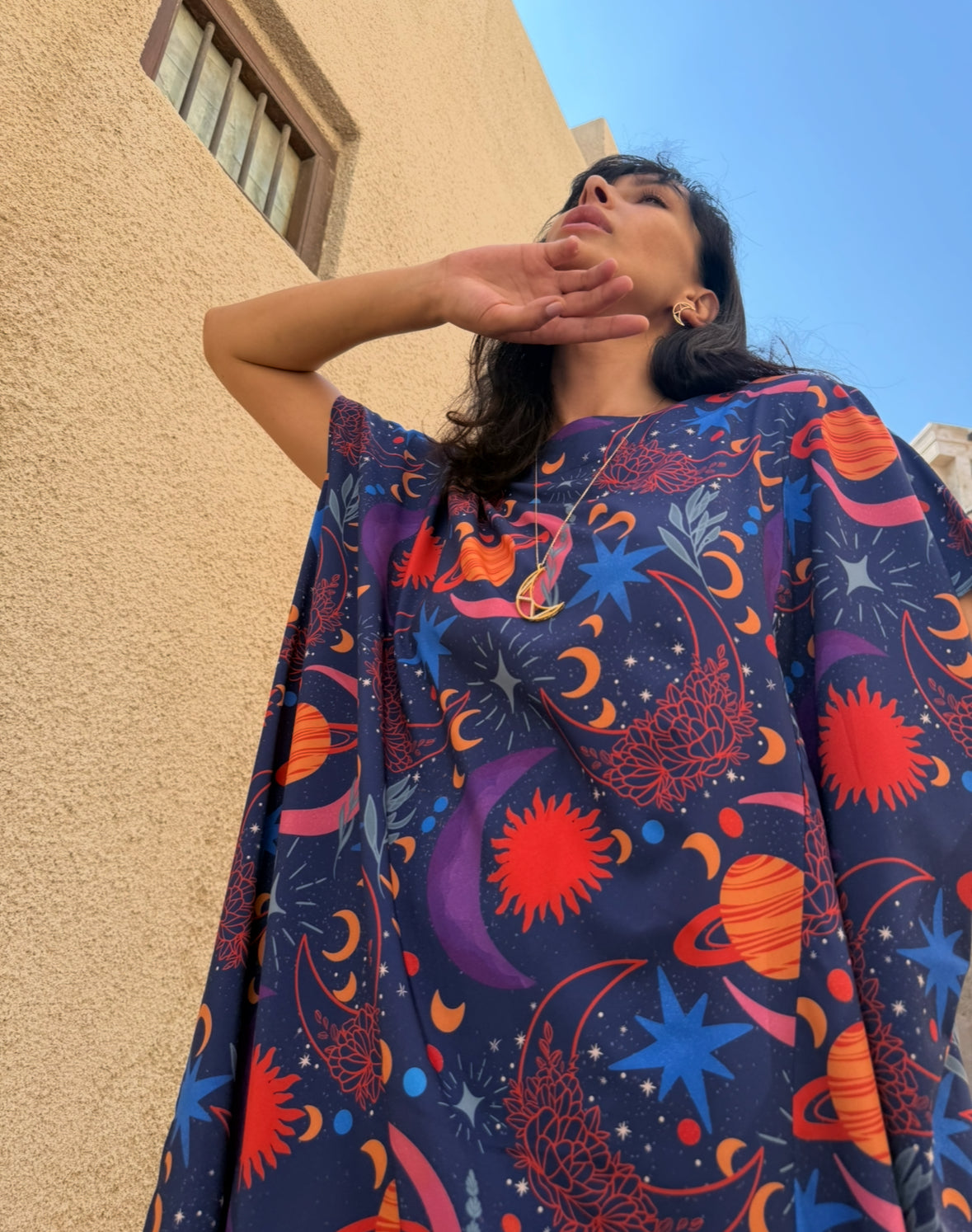 The founder of Mostawha believes that business collaborations inspire unique ideas and opportunities. Our first partnership with LEOMCHICC Fabric presents a space-themed print collection, featuring moons and galaxies. We’re thrilled to create something timeless and unique. Building on our crescent moon pendant, we’ve collaborated to design a custom fabric, marking its debut in the market.