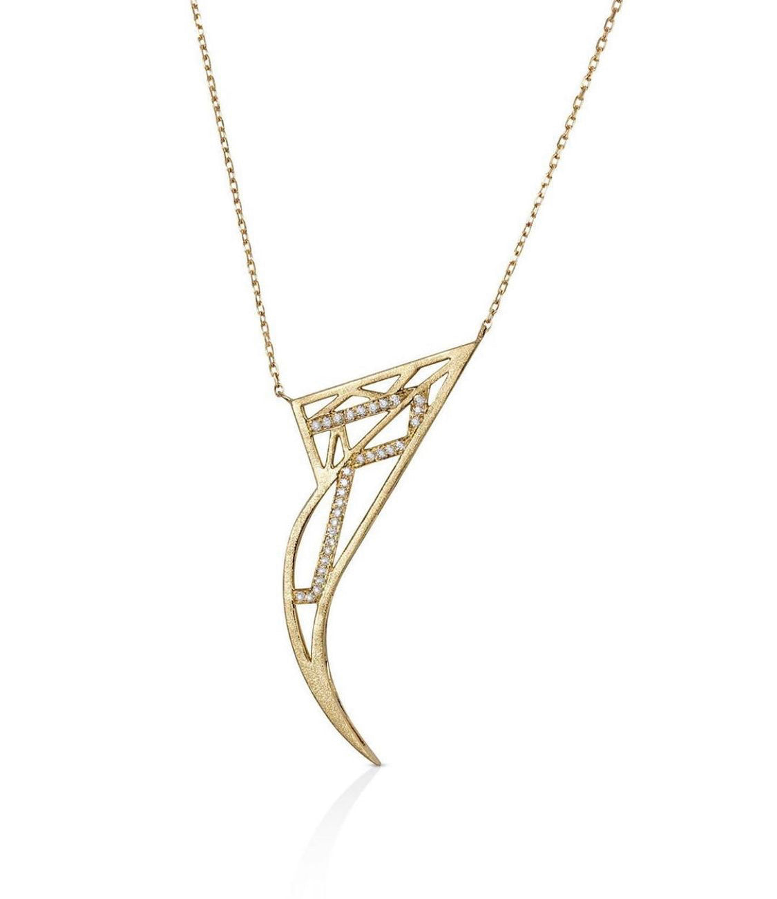 This pendant is crafted with 18k yellow gold with Two level of gold . Its key element is a unique triangle design inspired by Madrid's ABC Museum façade, complemented by exclusive Arabic letter designs. This is the alphabet Meem letter that represents 'M' in English.