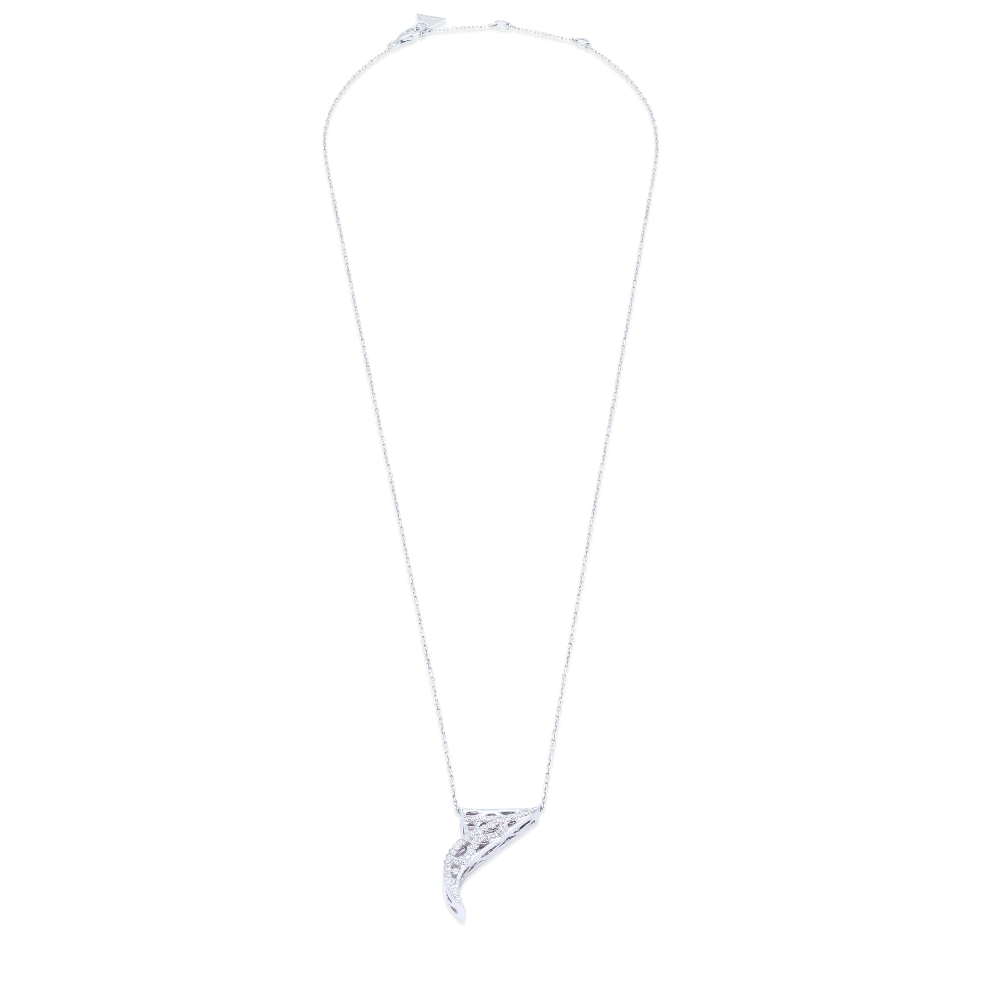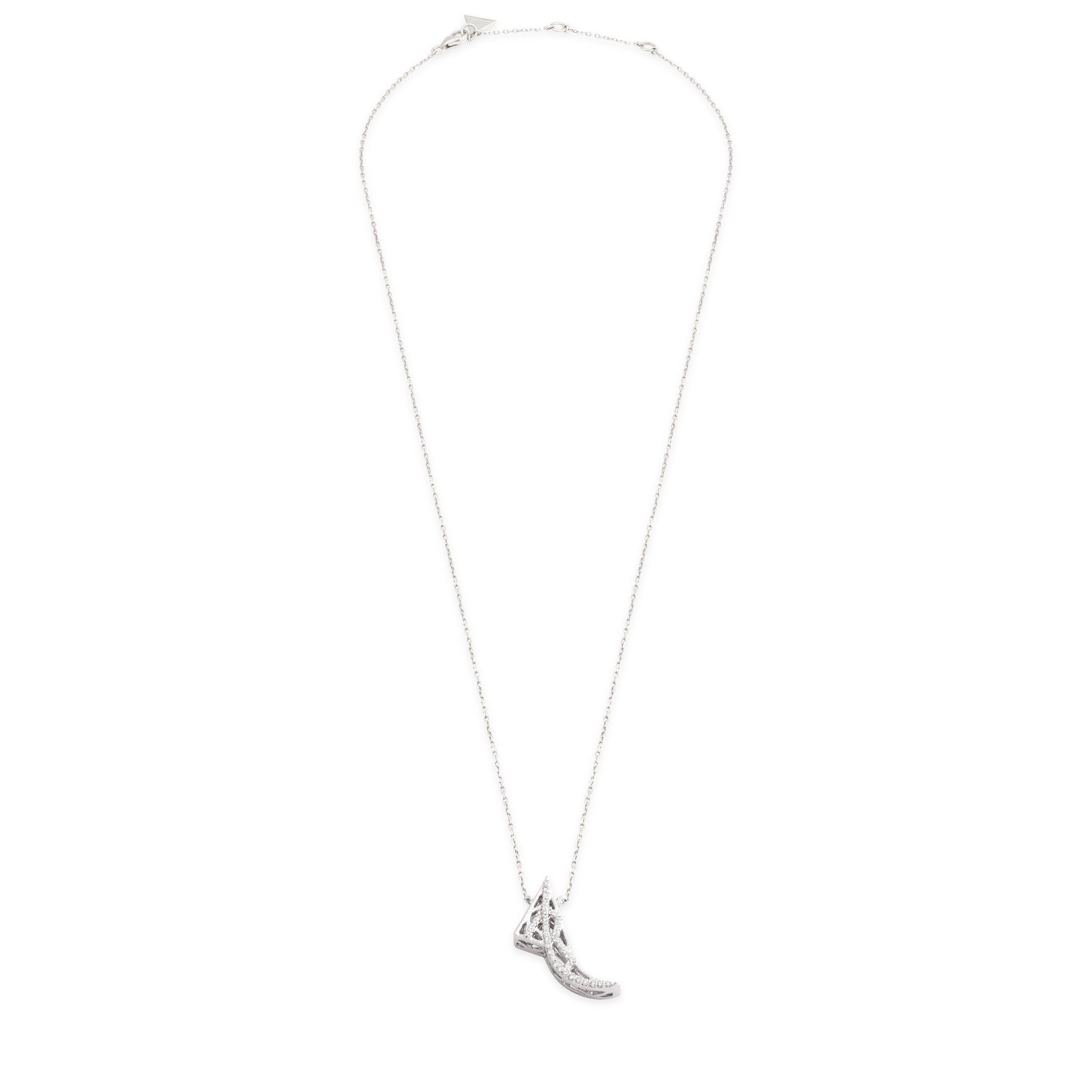 This pendant is crafted with 18k white gold with Two level of gold . Its key element is a unique triangle design inspired by Madrid's ABC Museum façade, complemented by exclusive Arabic letter designs. This is the alphabet Meem letter that represents 'M' in English.