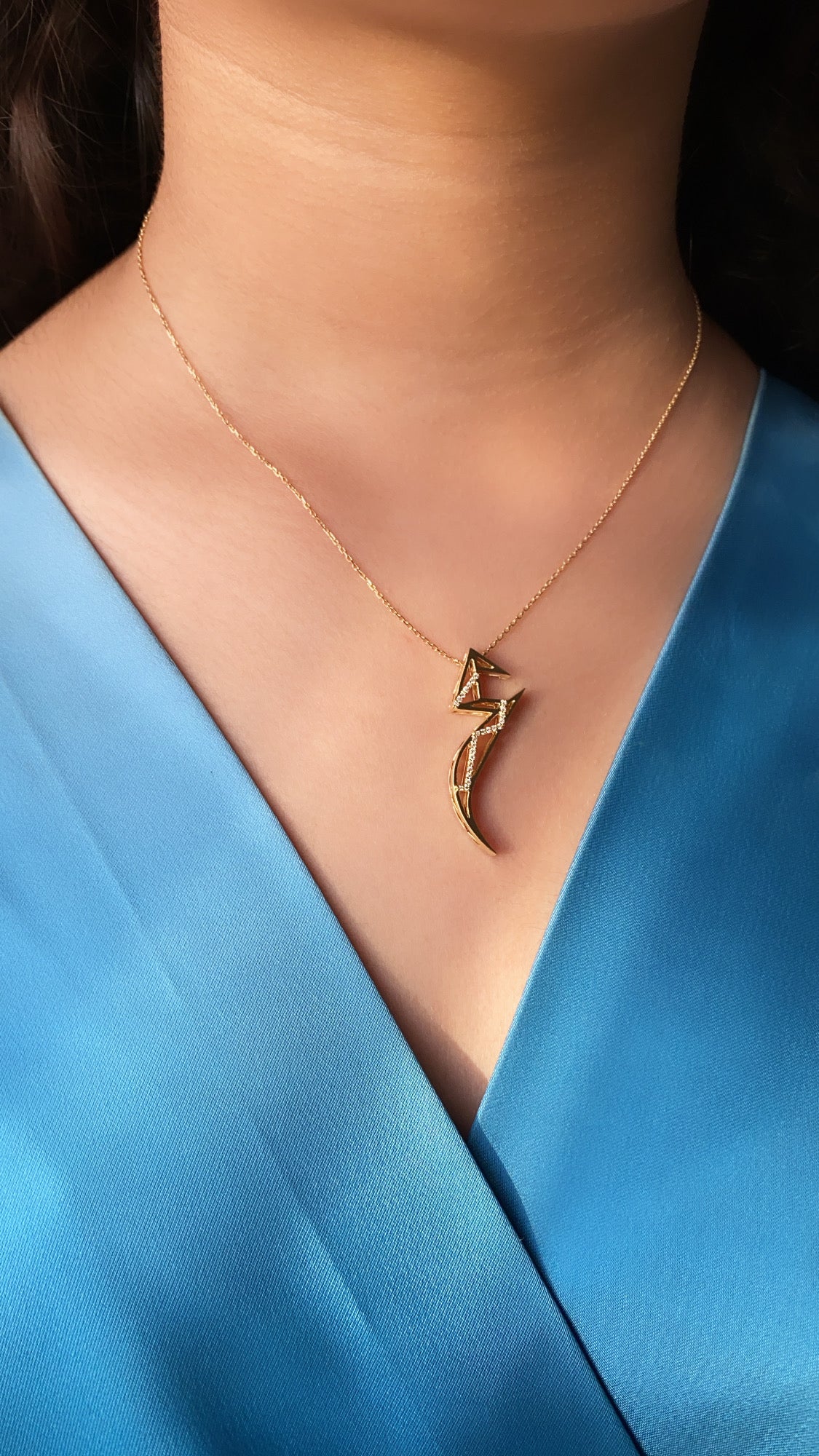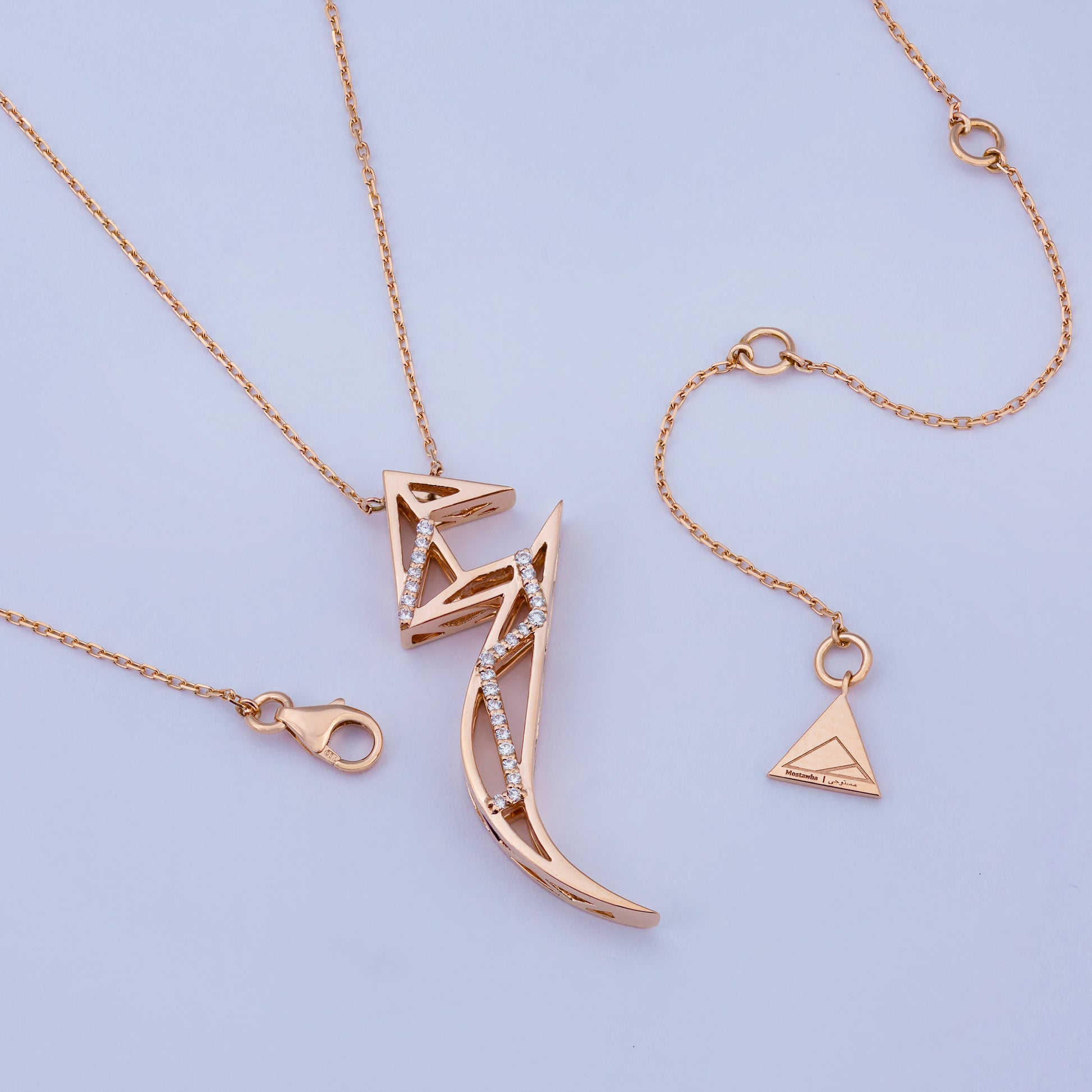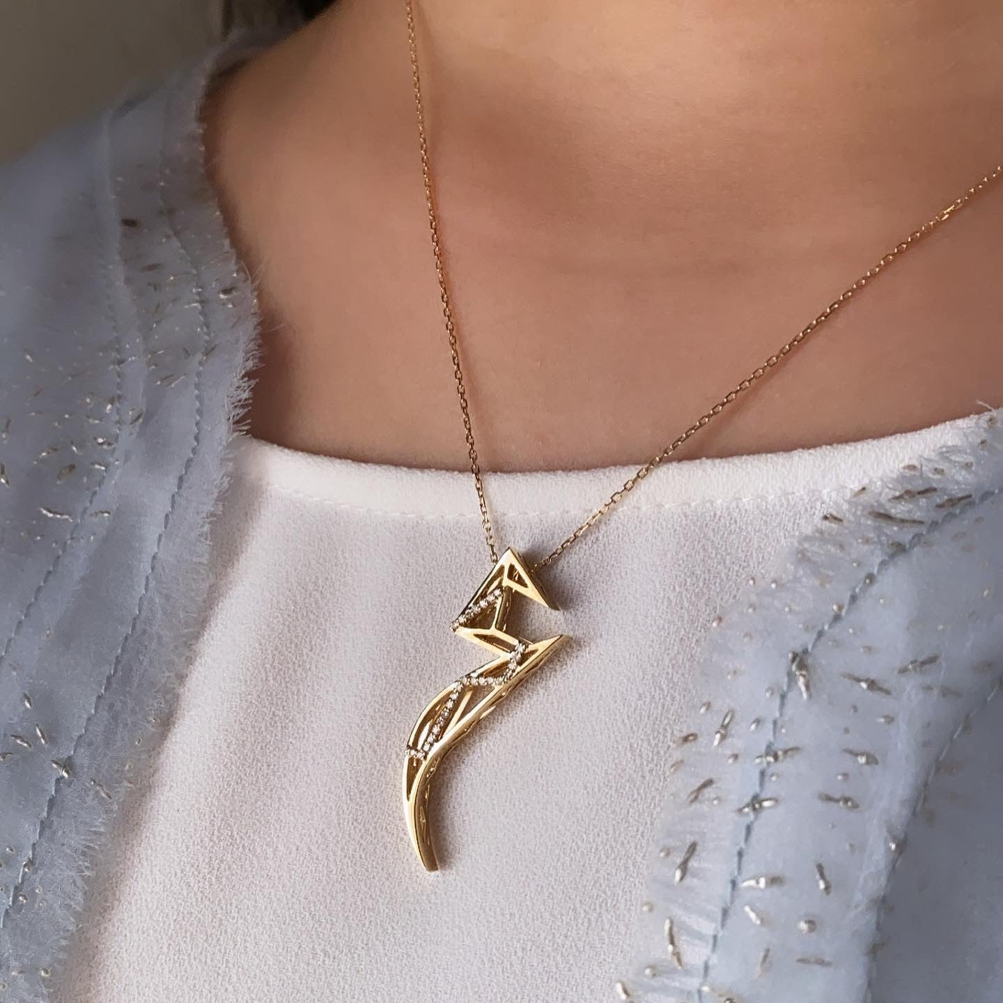 This pendant is crafted with 18k Rose gold with One level of gold, Its key element is a unique triangle design inspired by Madrid's ABC Museum façade, complemented by exclusive Arabic letter designs. This is the alphabet Ain letter that represents 'A' in English.