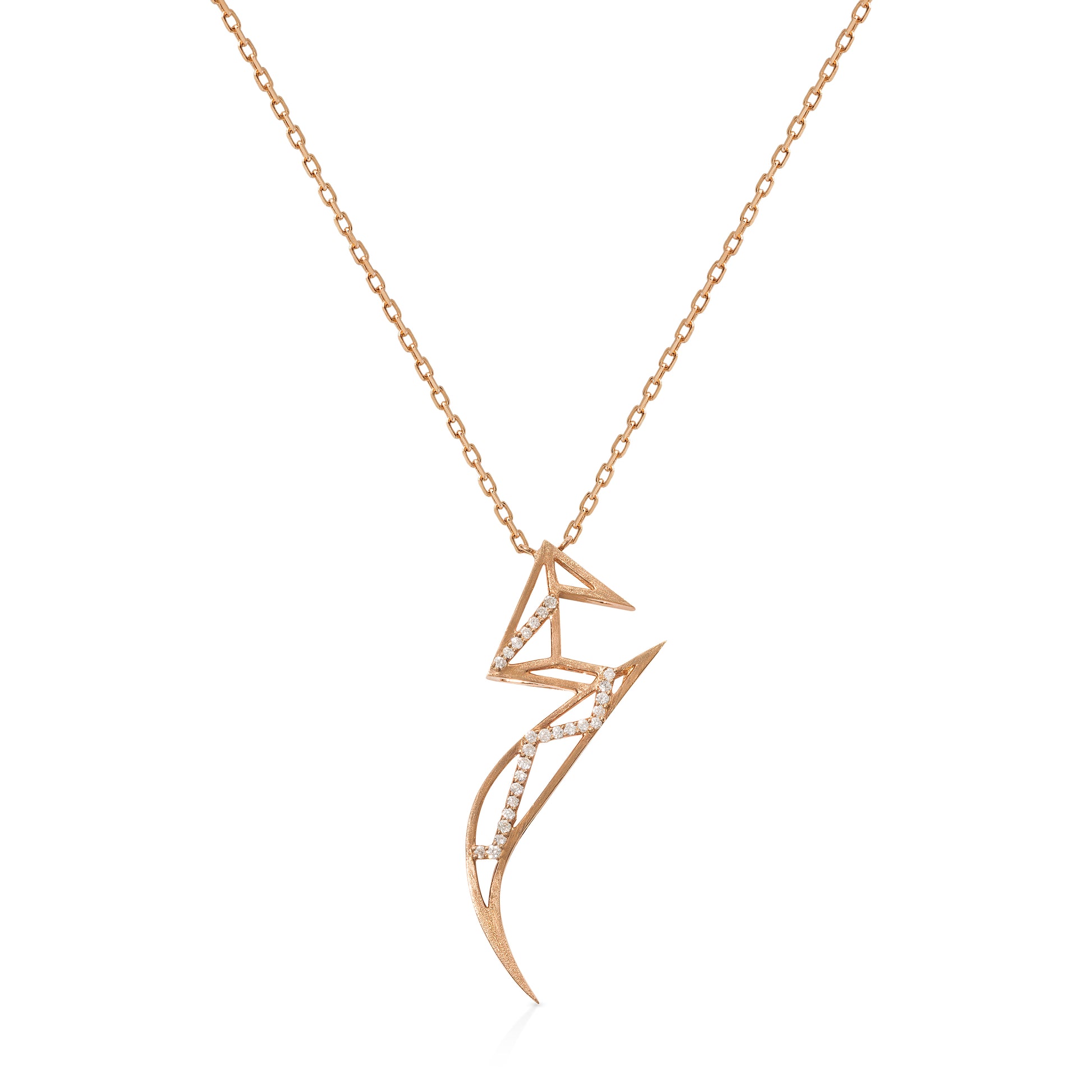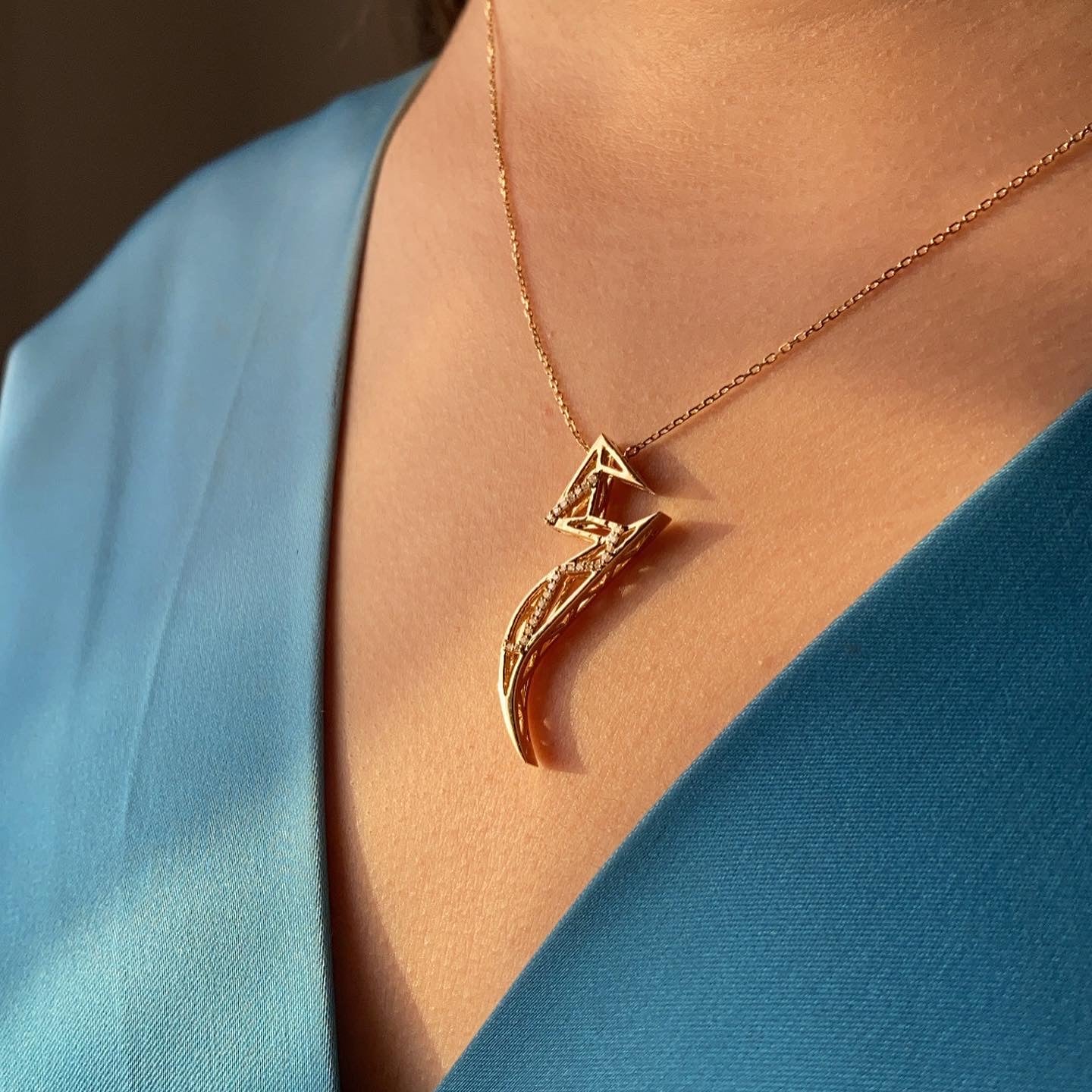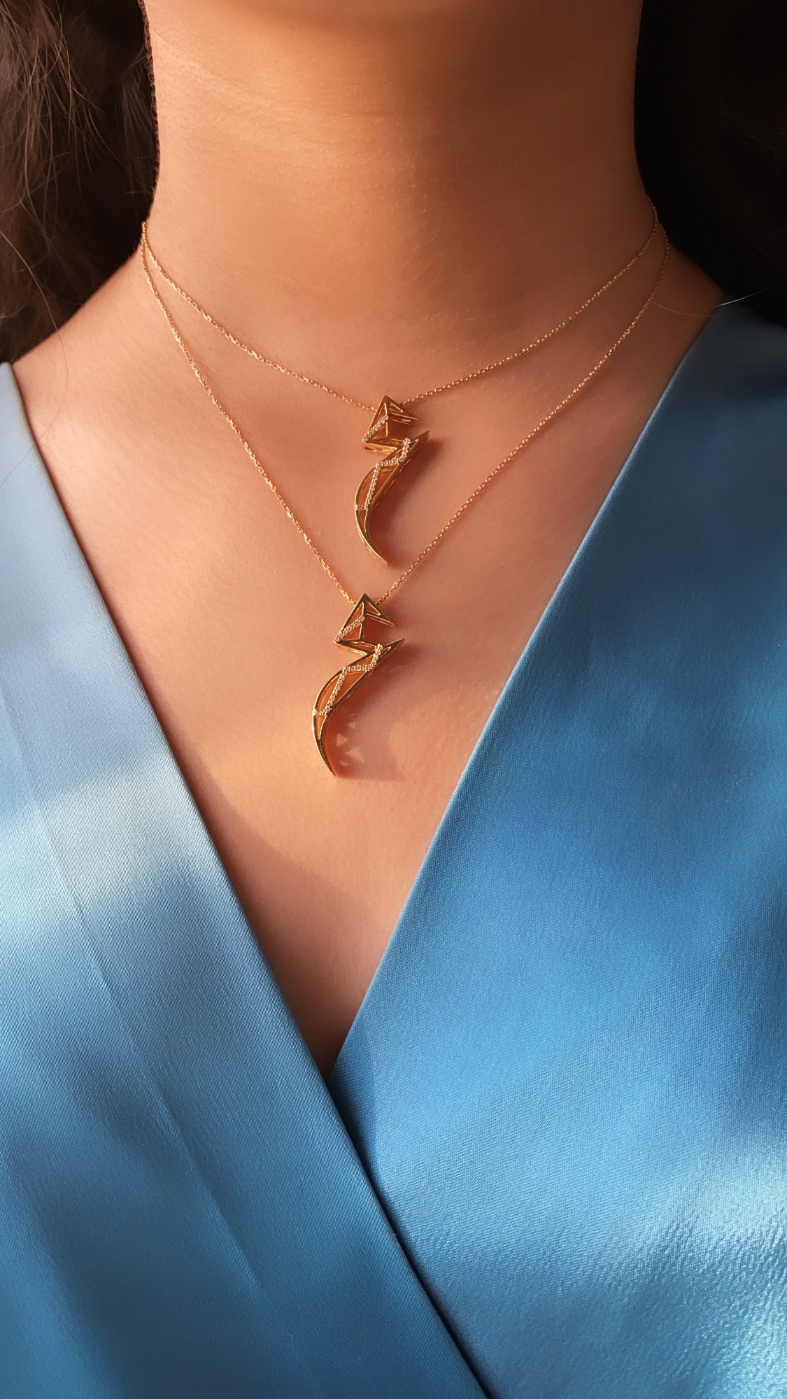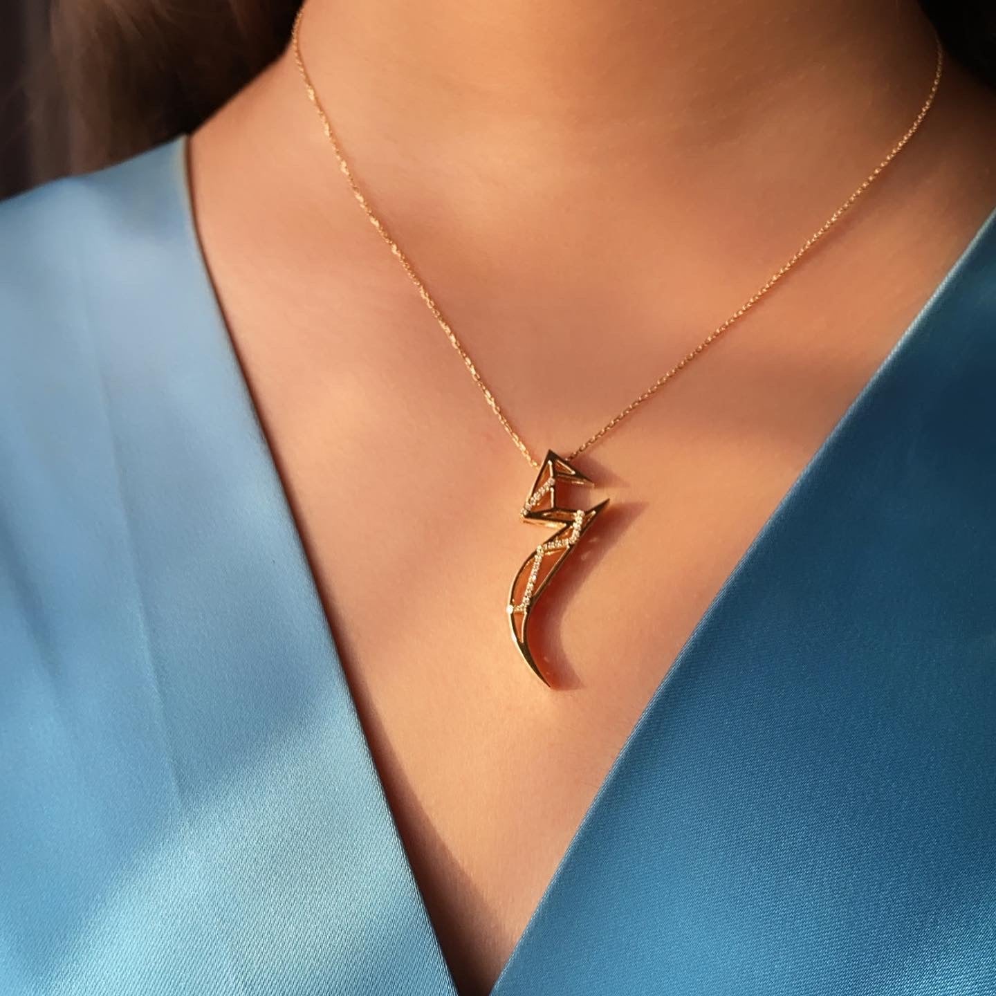 This pendant is crafted with 18k Rose gold with One level of gold, Its key element is a unique triangle design inspired by Madrid's ABC Museum façade, complemented by exclusive Arabic letter designs. This is the alphabet Ain letter that represents 'A' in English.