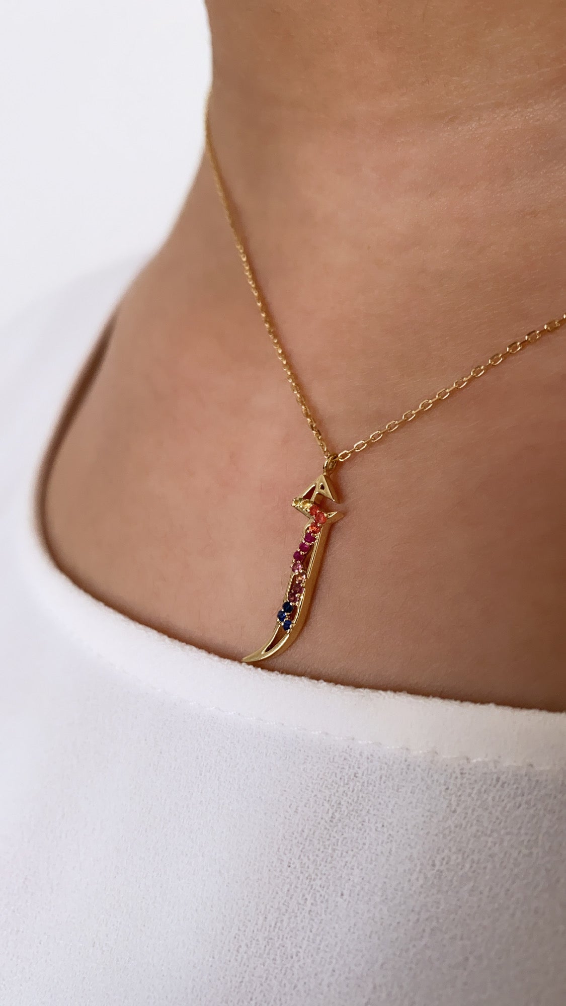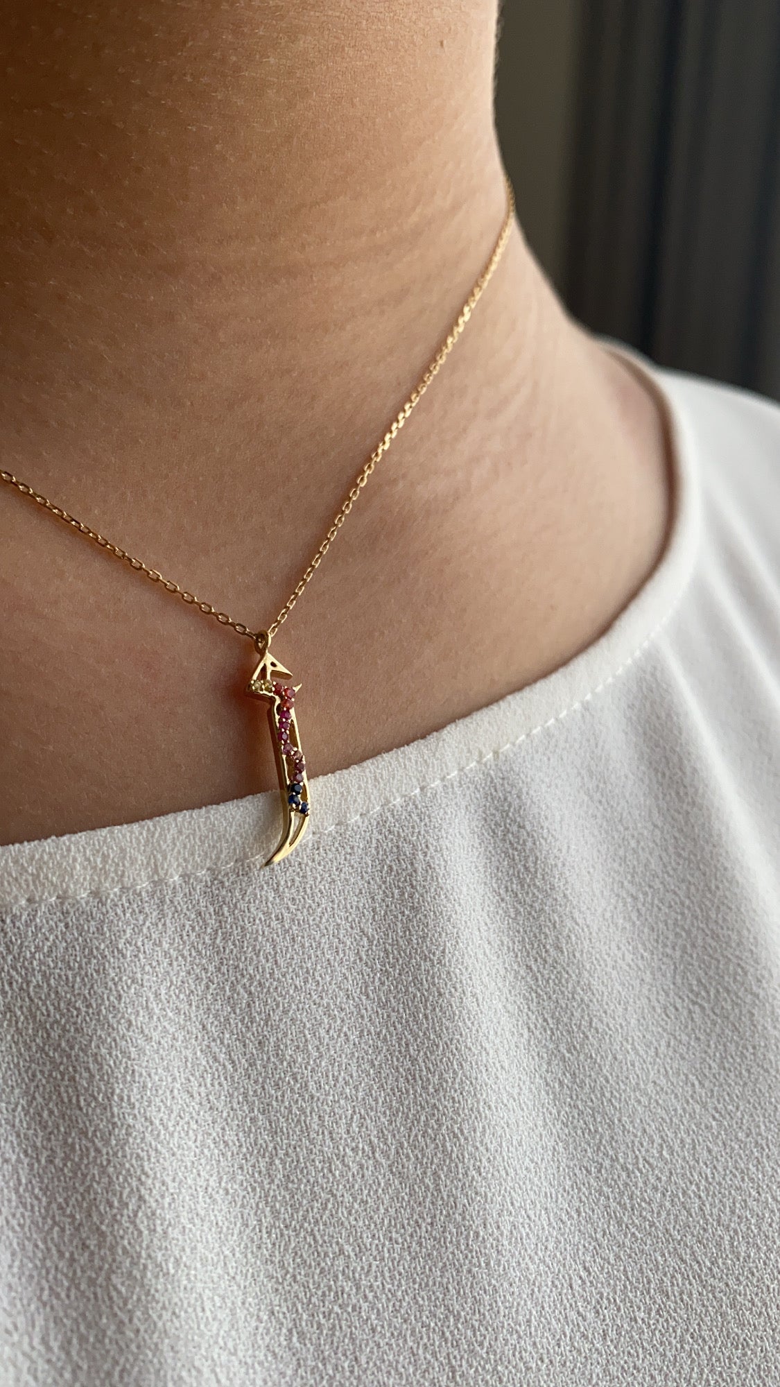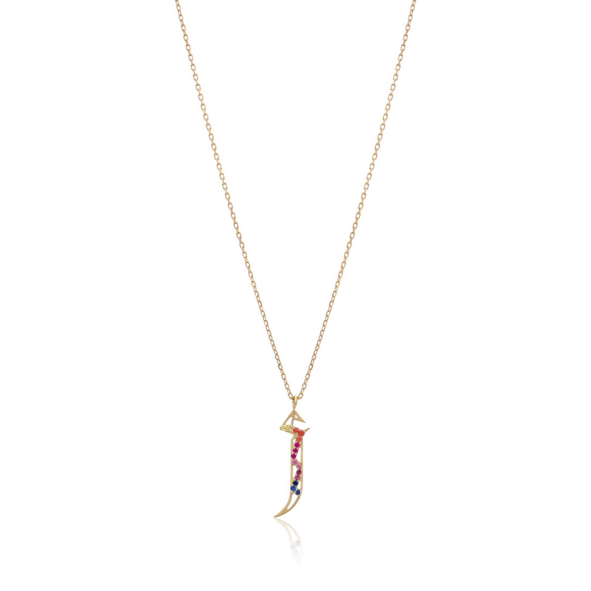 This pendant is crafted with 18k Yellow gold with Two level of gold . Its key element is a unique triangle design inspired by Madrid's ABC Museum façade, complemented by exclusive Arabic letter designs. This is the alphabet Alf letter that represents 'A' in English.