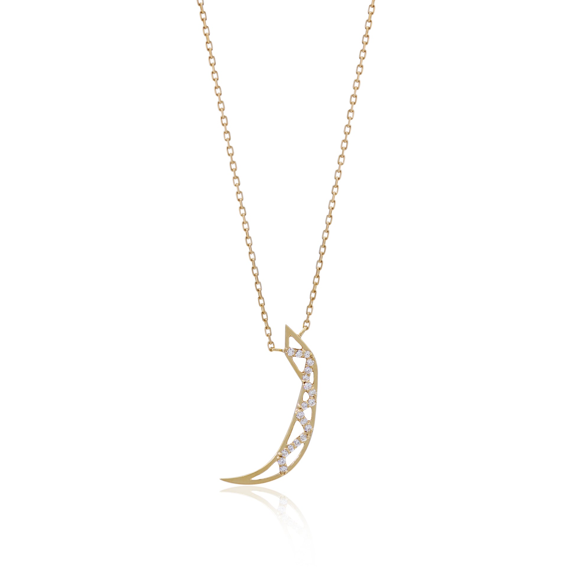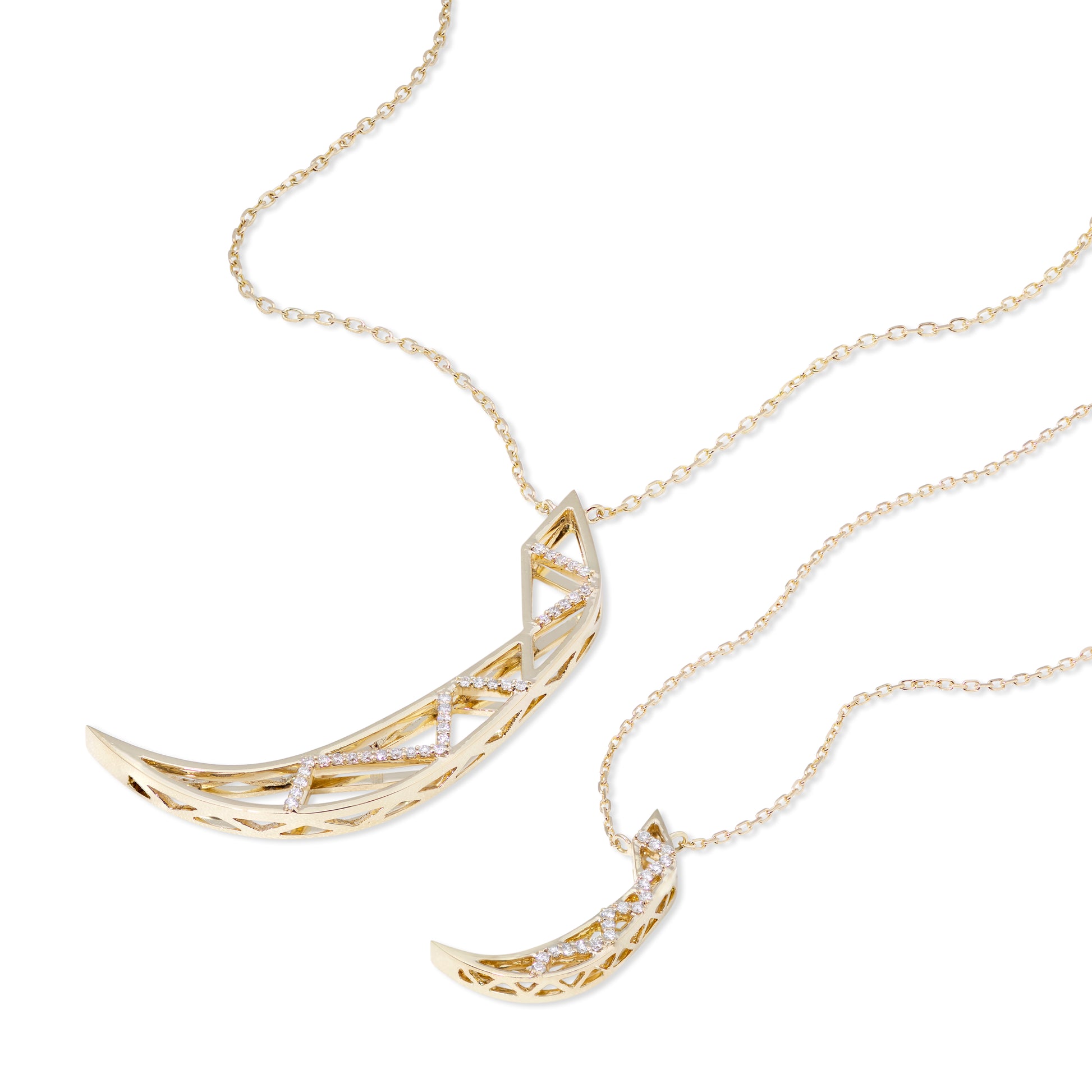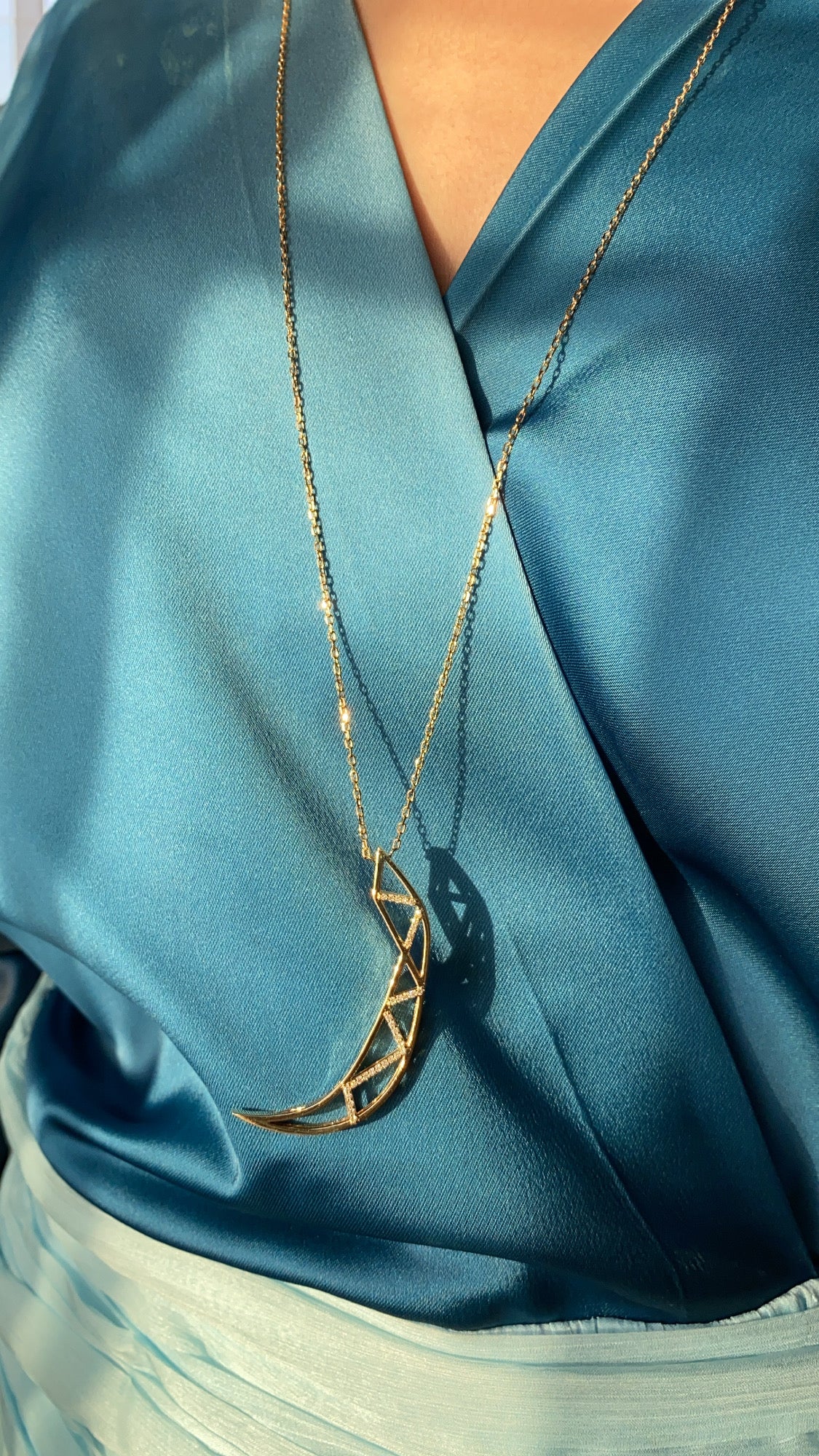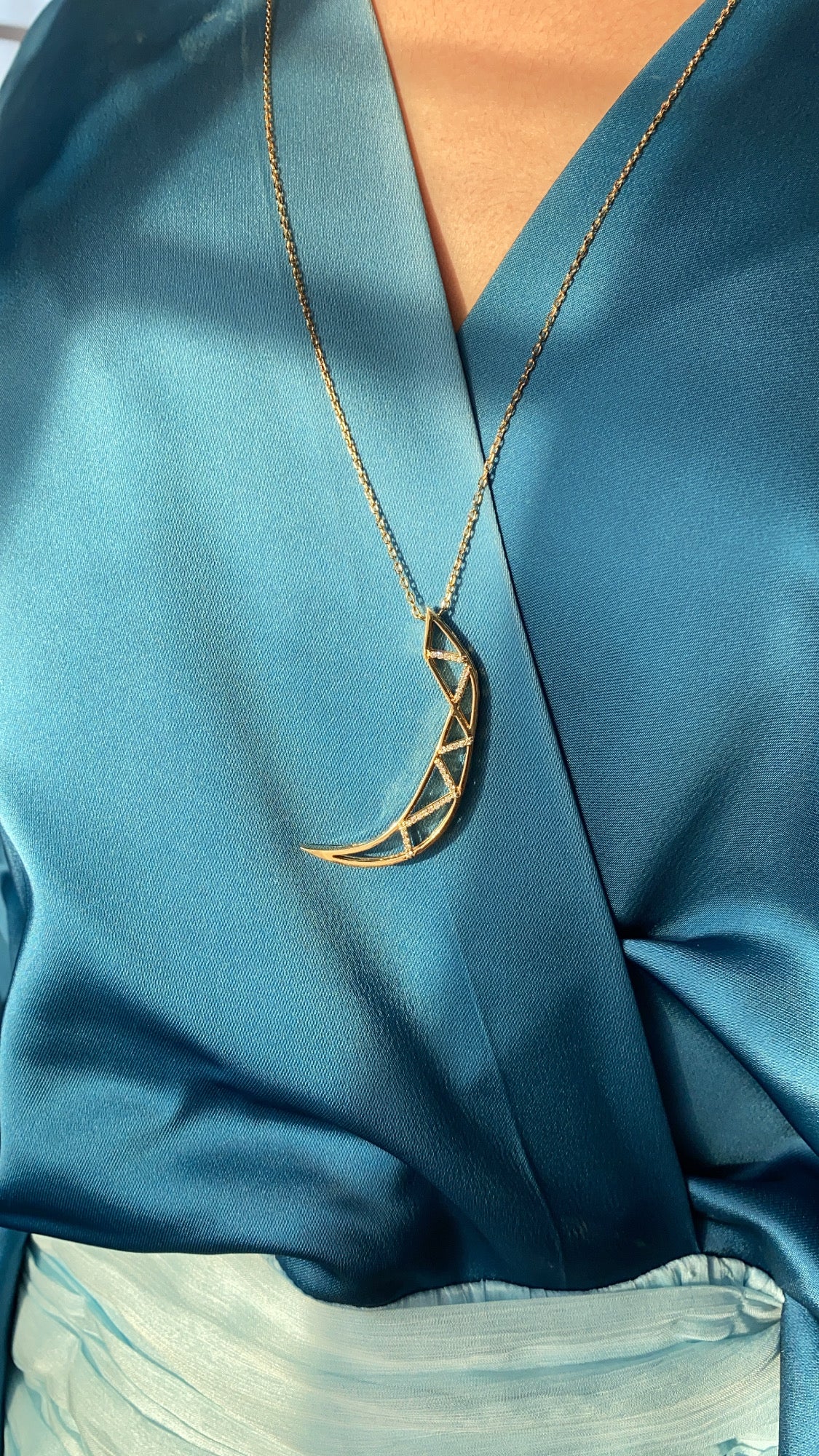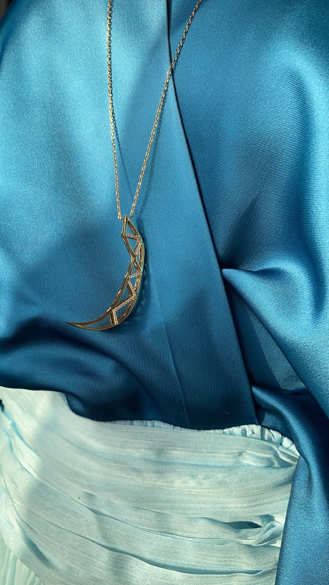 This pendant is crafted with 18k Yellow gold with Two level of gold . Its key element is a unique triangle design inspired by Madrid's ABC Museum façade, complemented by exclusive Arabic letter designs. This is the alphabet Raa letter that represents 'R' in English.