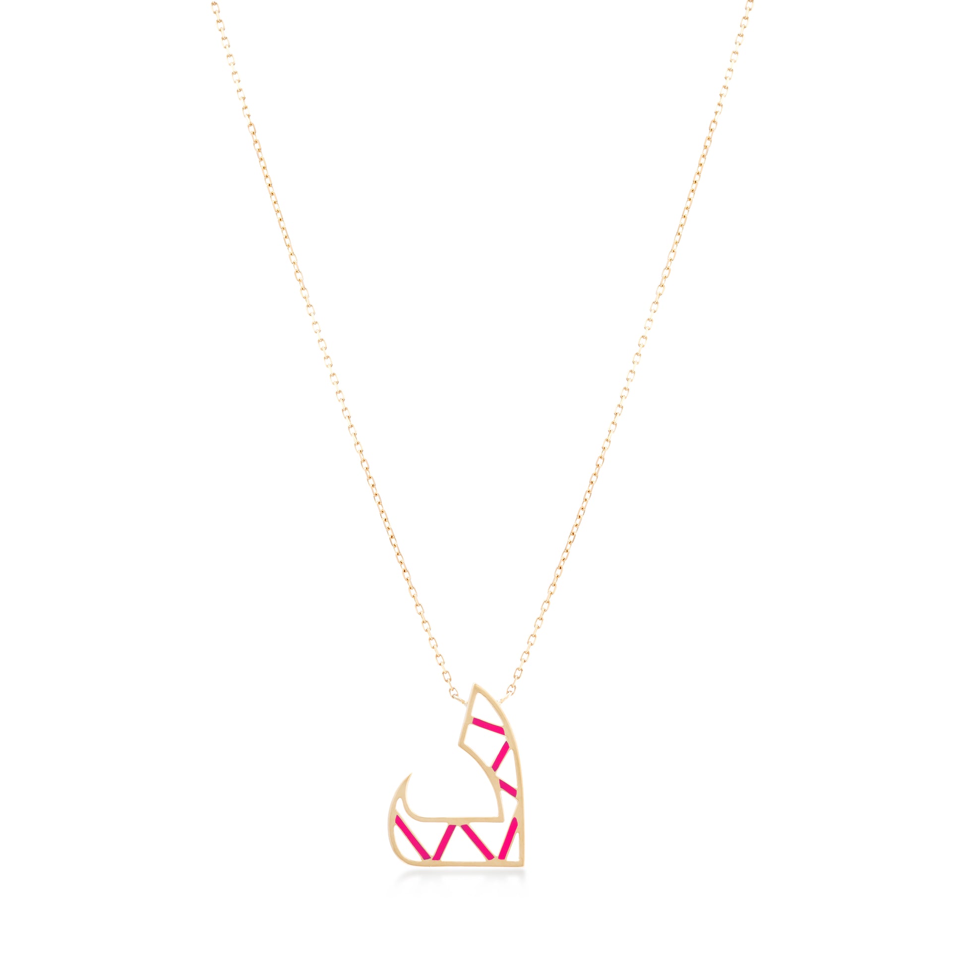 This pendant is crafted with 18k Yellow gold with Two level of gold . Its key element is a unique triangle design inspired by Madrid's ABC Museum façade, complemented by exclusive Arabic letter designs. This is the alphabet Daal letter that represents 'D' in English.