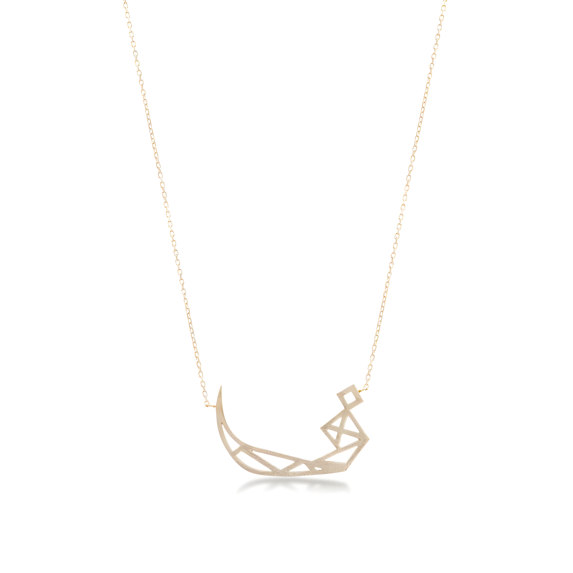 This pendant is crafted with 18k Yellow gold with Two level of gold . Its key element is a unique triangle design inspired by Madrid's ABC Museum façade, complemented by exclusive Arabic letter designs. This is the alphabet Faa letter that represents 'F ' in English.