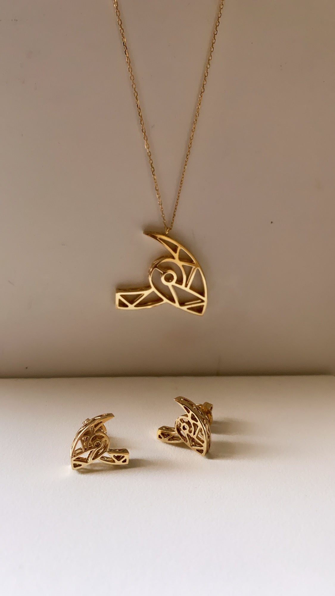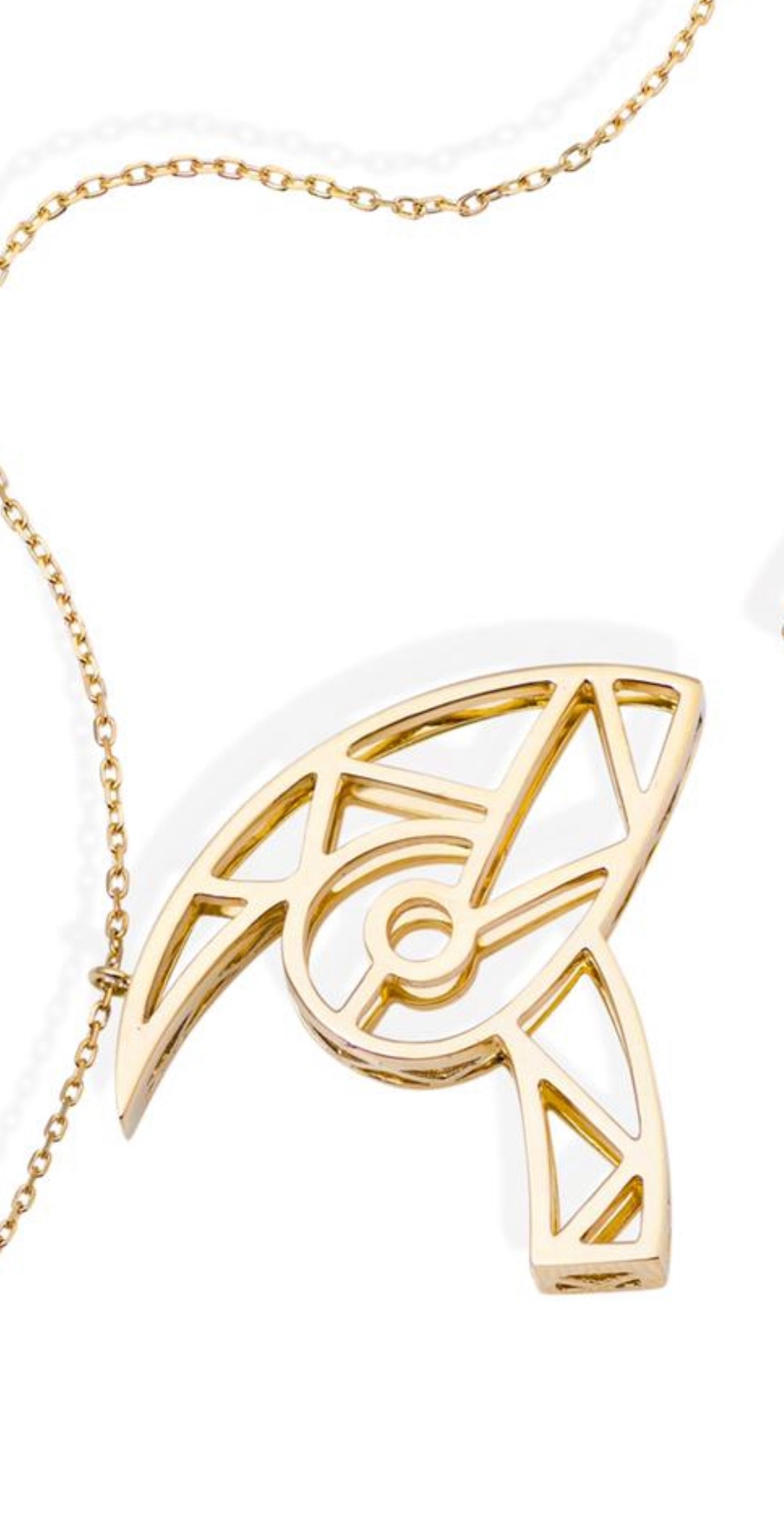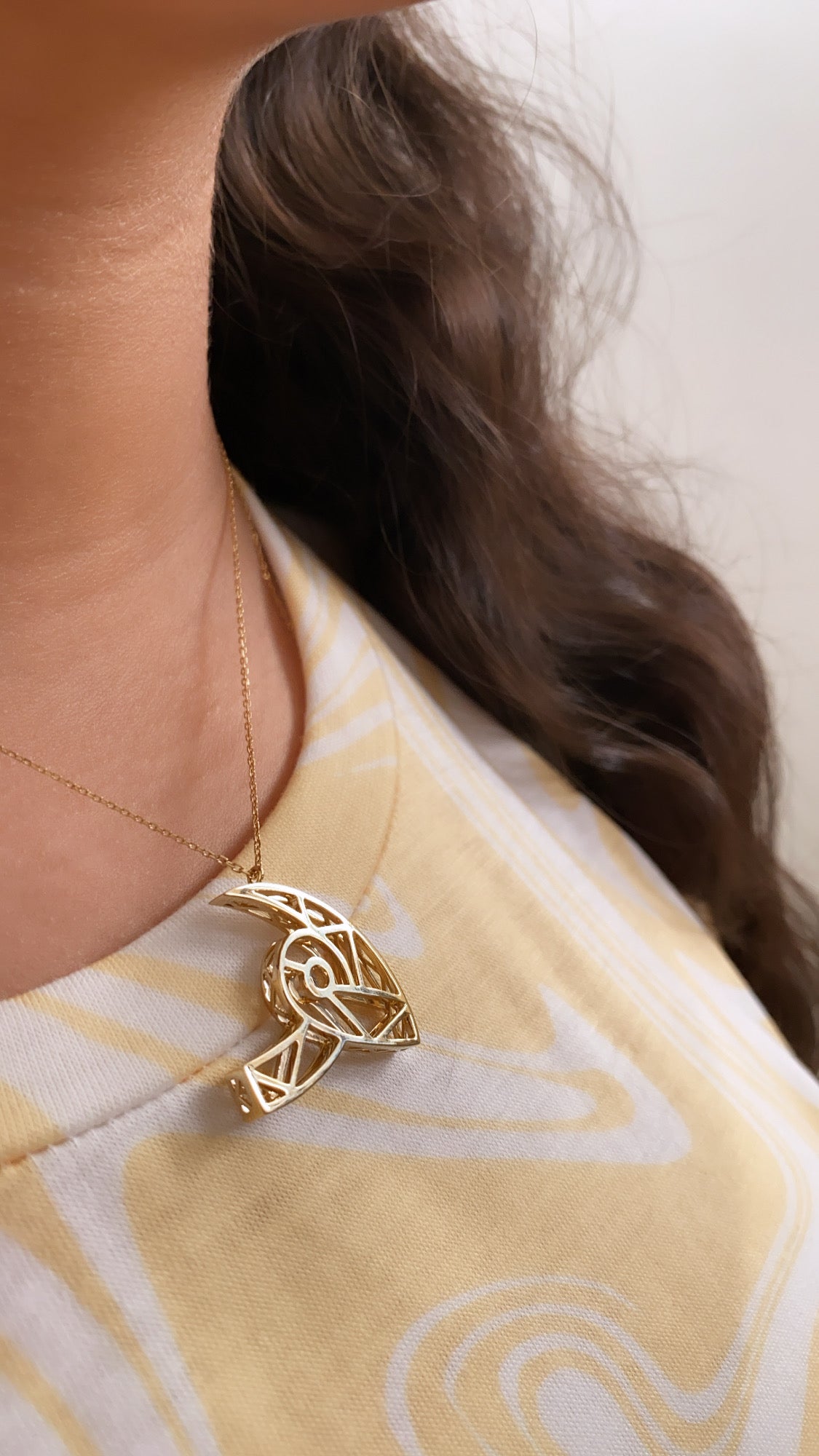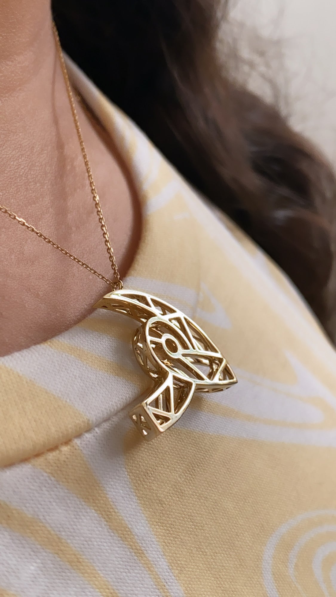 This pendant is crafted with 18k yellow gold with Two level of gold . Its key element is a unique triangle design inspired by Madrid's ABC Museum façade, complemented by exclusive Arabic letter designs. This is the alphabet Haa letter that represents 'H' in English.