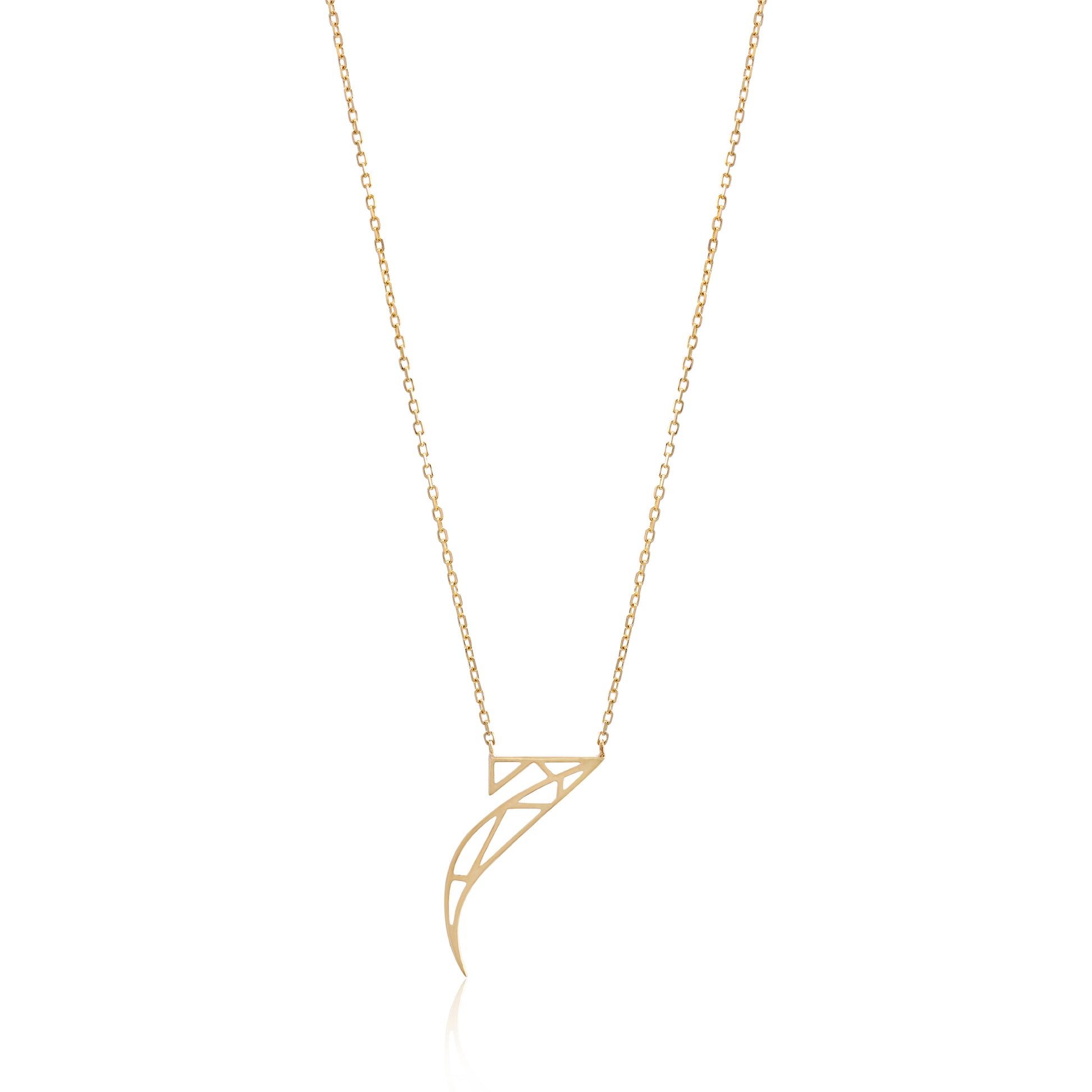 This pendant is crafted with 18k Yellow gold with Two level of gold . Its key element is a unique triangle design inspired by Madrid's ABC Museum façade, complemented by exclusive Arabic letter designs. This is the alphabet HHA letter that represents 'H ' in English.