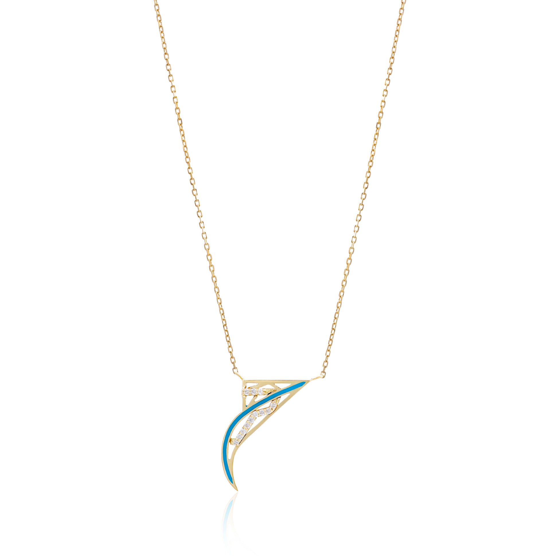 This pendant is crafted with 18k yellow gold with Two level of gold . Its key element is a unique triangle design inspired by Madrid's ABC Museum façade, complemented by exclusive Arabic letter designs. This is the alphabet Meem letter that represents 'M' in English.