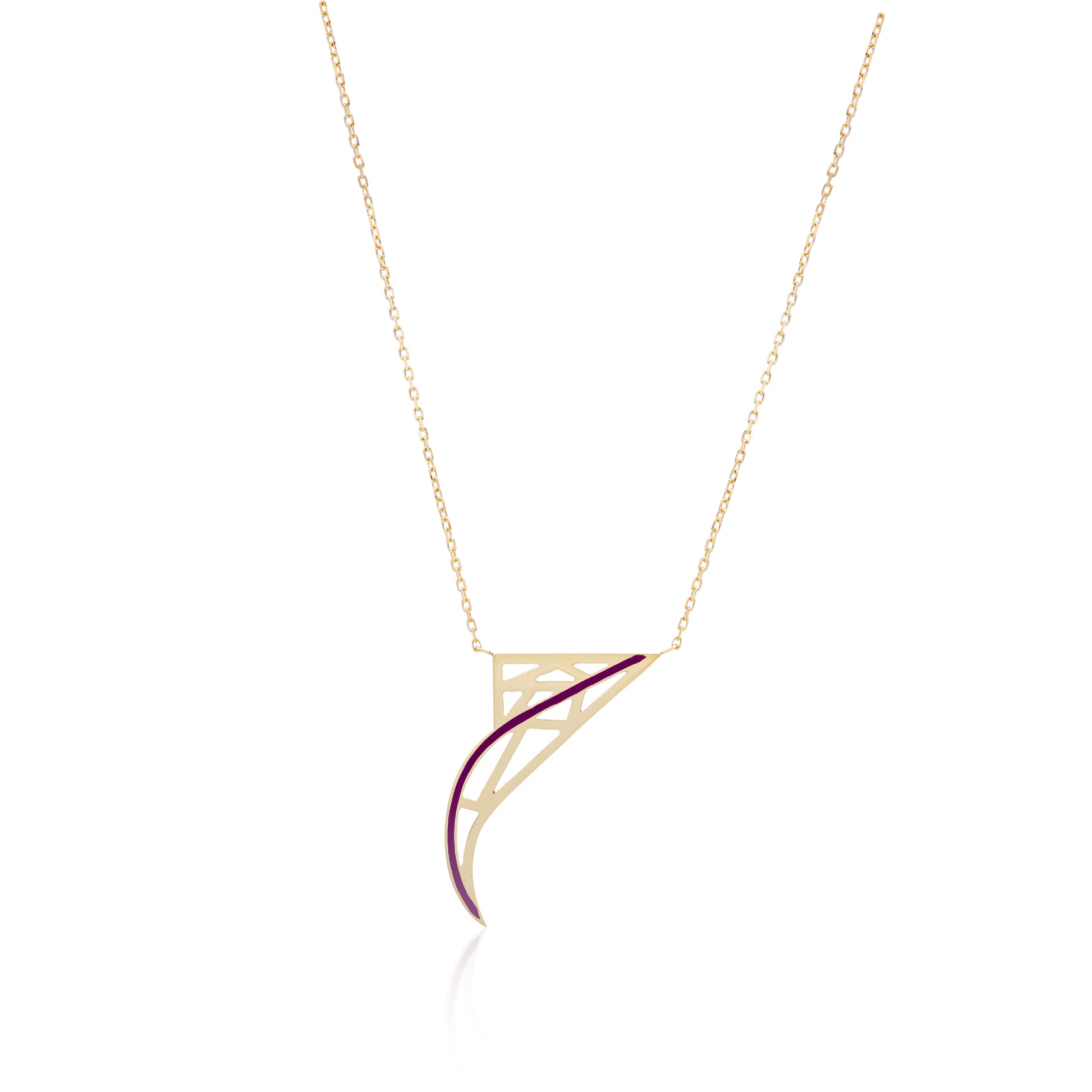 This pendant is crafted with 18k yellow gold with Two level of gold . Its key element is a unique triangle design inspired by Madrid's ABC Museum façade, complemented by exclusive Arabic letter designs. This is the alphabet Meem letter that represents 'M' in English.