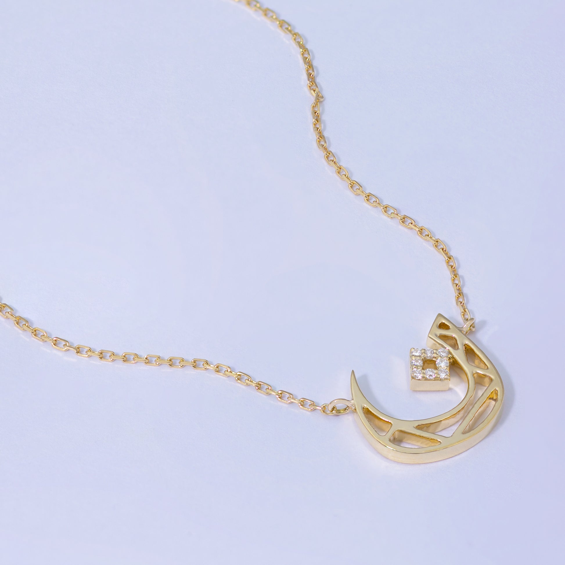 This pendant is crafted with 18k yellow gold with One level of gold . Its key element is a unique triangle design inspired by Madrid's ABC Museum façade, complemented by exclusive Arabic letter designs. This is the alphabet Noon letter that represents 'N' in English.