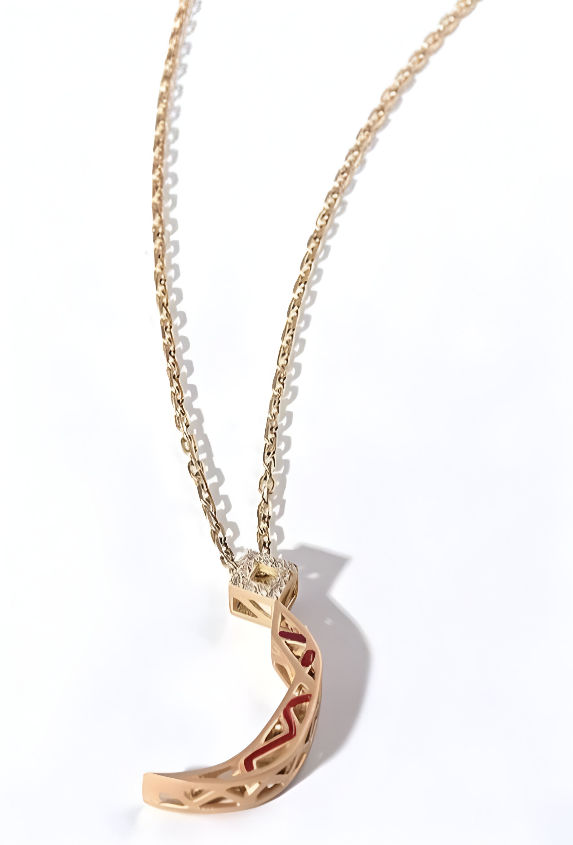 This pendant is crafted with 18k Yellow gold with Two level of gold . Its key element is a unique triangle design inspired by Madrid's ABC Museum façade, complemented by exclusive Arabic letter designs. This is the alphabet Zaa letter that represents 'Z' in English.