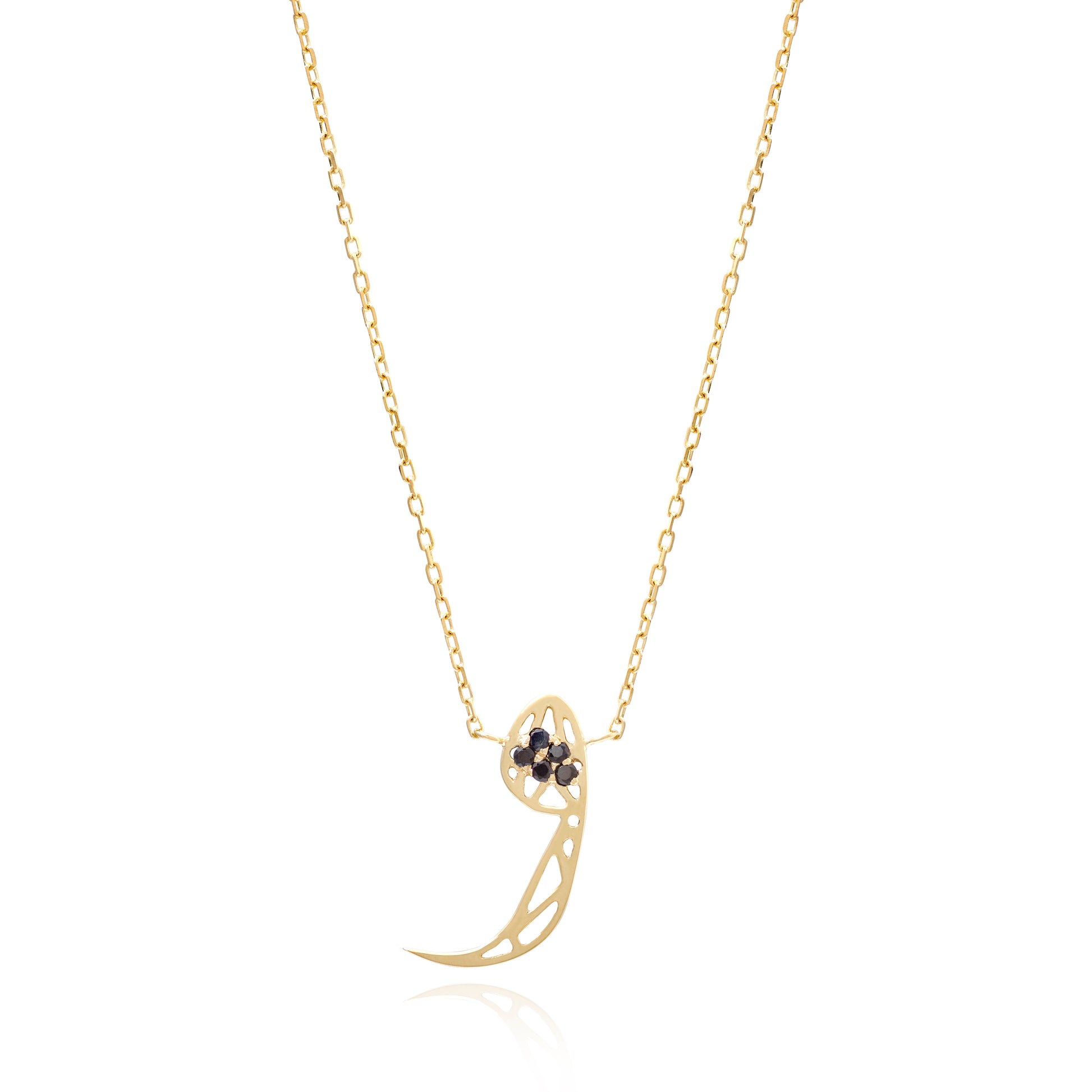 This pendant is crafted with 18k Yellow gold with one level of gold and black diamonds. Its key element is a unique triangle design inspired by Madrid's ABC Museum façade, complemented by exclusive Arabic letter designs. This is the alphabet Woow letter that represents 'W' in English.