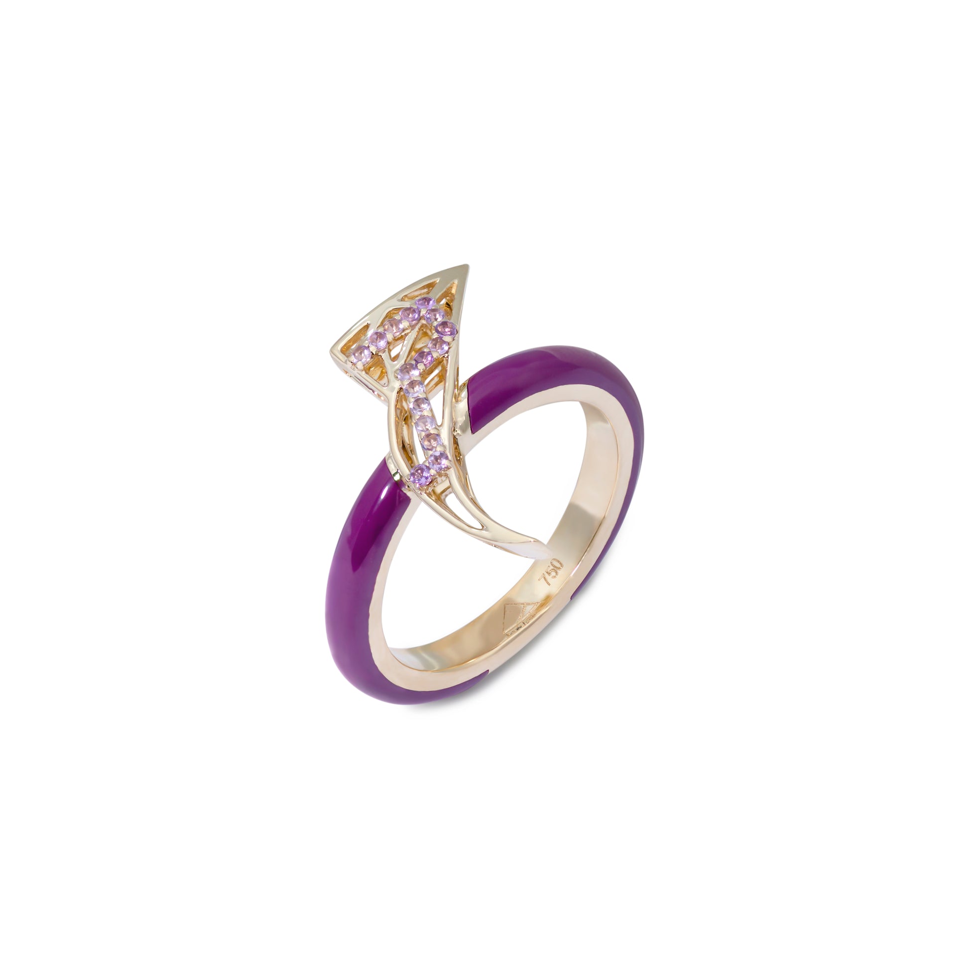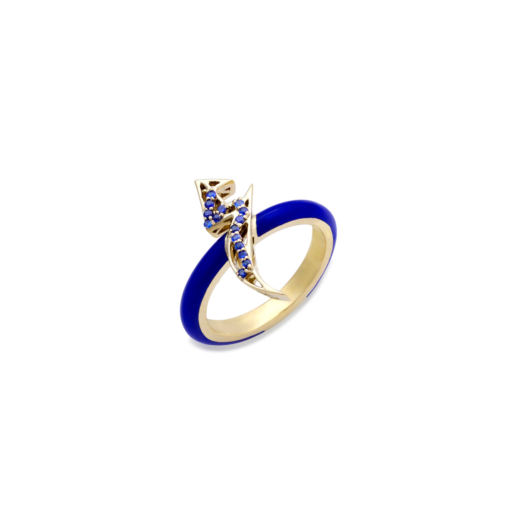 This ring is crafted with 18k yellow gold with one color of enamels, stones and two levels of gold. Its key element is a unique triangle design inspired by Madrid's ABC Museum façade, complemented by exclusive Arabic letter designs.