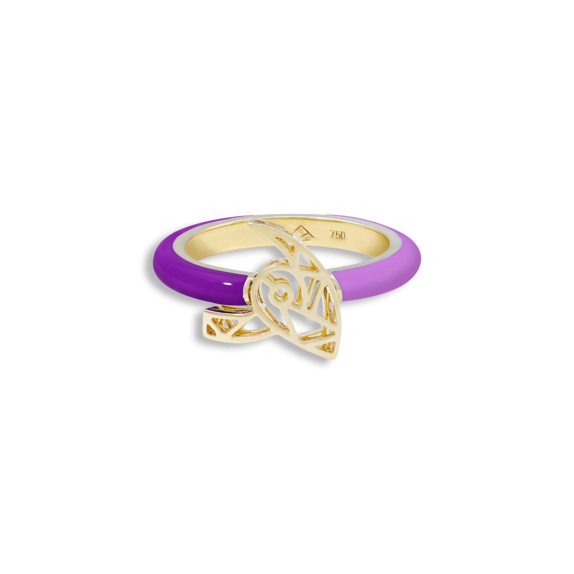 This ring is crafted with 18k yellow gold with two color of enamels and two levels of gold. Its key element is a unique triangle design inspired by Madrid's ABC Museum façade, complemented by exclusive Arabic letter designs.
